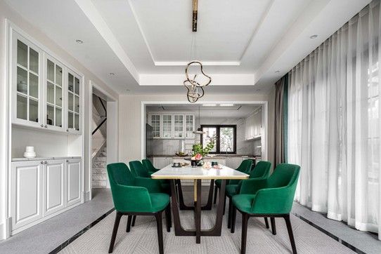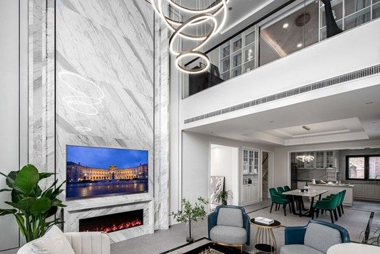 设计师用现代的设计手法,将生活空间的艺术美学与功能完美融为一体。极简的色彩搭配,点线面的完美融合,演绎出舒适的智能实用空间。一层的设计,设计师取消原有的卫生间,将空间最大化释放,半包围的不通顶墙板的设计,搭配L型休闲沙发,围式的不对称设计,将空间灵动性展现的淋漓尽致。餐厨区域使用开放式设计,设计师将餐桌与岛台完美融合,在保证美观的同时确保空间功能性的最大化利用,内嵌电器与平板通顶高柜的整体感极大提高了空间的高级感。