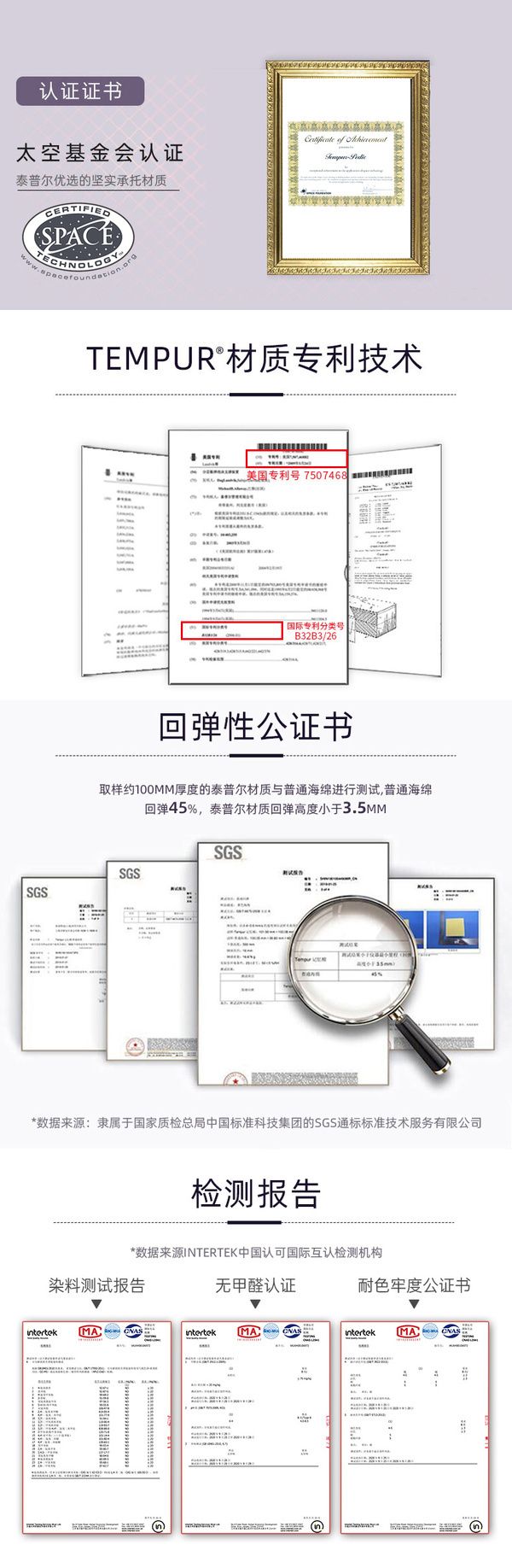 除此之外,泰普尔舒芯枕、舒适枕、舒梦枕具有多项认证报告。