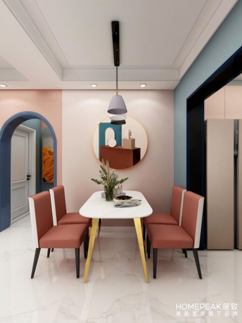视觉效果鲜艳餐厅罕见地采用了红绿配色,还为墙上的壁龛涂上金茶色,这样的大胆搭配不仅没有让用餐空间视觉混乱,反而是让空间变得更加鲜活。在餐厅之中,深绿色的餐柜作为背景点缀元素,以浑厚的形象为餐厅奠定了自然清新的格调。餐椅的西柚色搭配金色支架,展示了现代简约风格的轻奢格调。