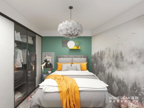清新绿色背景墙,悠扬空间在视觉上继续延续复古格调的卧室。搭配现代风格的实木床,灰与黄的视觉搭配,营造出卧室内的轻盈复古氛围。床边一盏艺术感十足的台灯,是与吊灯相对的巧妙用心,入夜时只留一盏台灯,照亮一片暖黄的氛围,让居住者尽管安然入眠。