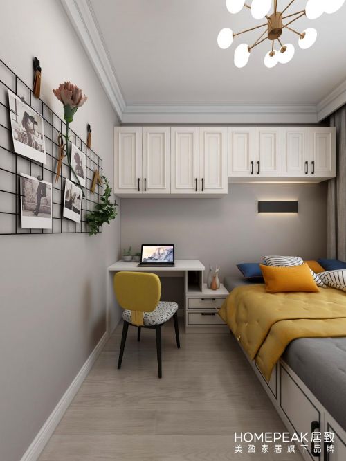 次卧采用了全系的象牙白装饰空间,使用具有收纳功能的榻榻米,搭配嵌入式的收纳柜和书桌,让空间收纳更加得心应手,整个次卧空间都变得简洁舒适。