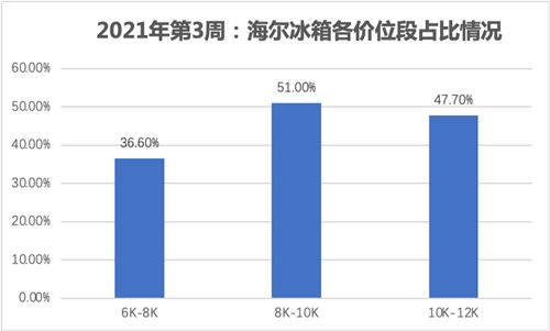 2021年第3周,冰箱市场迎来整体回温。高端冰箱更是实现了翻番式增长,1W+价位段增速超过250%。凭借在高端市场的高占比,海尔冰箱以40.2%份额实现领跑。