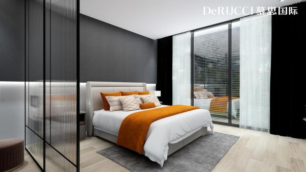 鲸鱼跃于水面,水花溅起完美的彩虹弧度。恍若澳洲昆士兰海岸线鲸鱼跃出海面的优美流畅弧线,弧形靠包让依靠更加贴合舒适,视觉上大气耐看。大气中透出恢弘的美感,近乎无色的空间里,米灰拼接的床架如同卧室的眼睛,点亮居者的高级品位。漫不经心摆放的爱马仕橙沙发椅和同色系时尚落地灯,彰显现在新中产的审美意趣,简约而不简单,为居家生活减负,追求放松,舒适,宁静的卧室生活。