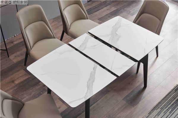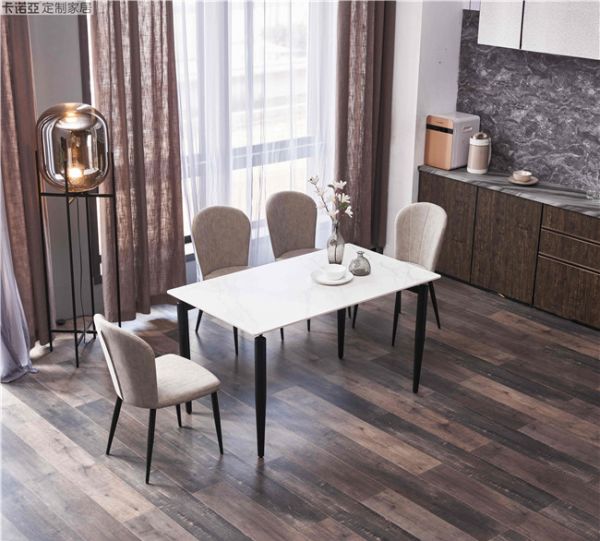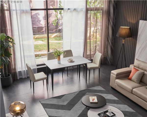 4.餐桌台面使用岩板,增添高端碳素钢脚,坚韧刚劲,具备出色的承重力。