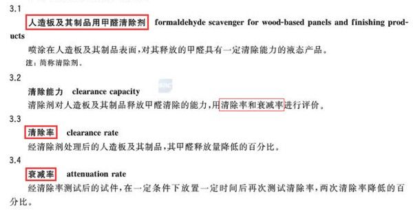 该标准主要参与制定人,也是国内长效甲醛清除剂研发技术专家陈晓鹏向我们介绍:判断人造板甲醛清除剂的效果,有两个重要指标,一个是“甲醛清除率”,一个是“衰减率”。甲醛清除率是指使用产品24小时后甲醛降低的百分比,反映的是产品清除甲醛能力的强弱;衰减率是指7天后的甲醛清除率比24小时的清除率降低了多少,因此,衰减率反映的是人造板甲醛清除剂是否具有长期效果,长期效果是否稳定。