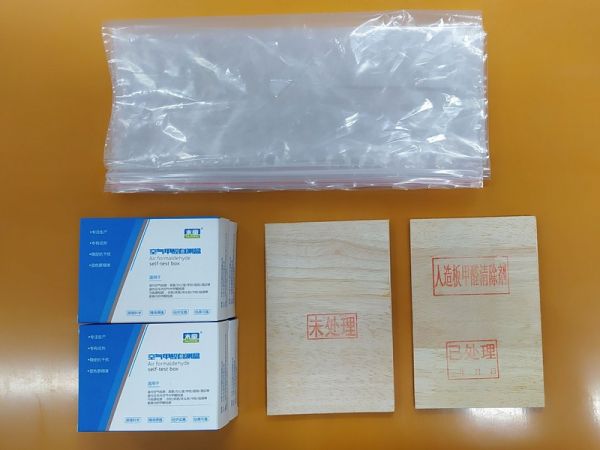 两块七厘板,一块用人造板甲醛清除剂处理过,一块没有处理过,将这两块板分别放入自封口的塑料袋中,密封2-6小时。然后再分别放入甲醛自测盒,30分钟后就能测得两块板子释放出来的甲醛含量。通过这个简单的方法,就能验证人造板甲醛清除剂是否有效。