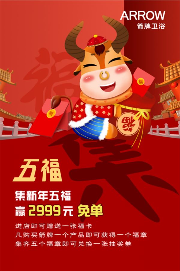 近日,箭牌卫浴发起以“春节不打烊——箭牌年货节”为主题的全国门店联动年货节活动。自2021年1月15日至2月21日,推出新年焕新家,集五福赢免单豪礼等优惠活动。