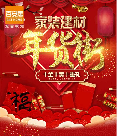 特殊情况,留在原地过年就是我们每个人对国家和小家最好的守护,而“家装建材年货街”是百安居献给“原地过年”的大家最温暖的家居守护。百安居“家装建材年货街”用十重大礼、诚意满满的行动,让消费者在春节期间尽情选购高性价比的家居产品及轻松享受极致的服务,让消费者享受美好家居,欢度温馨牛年!