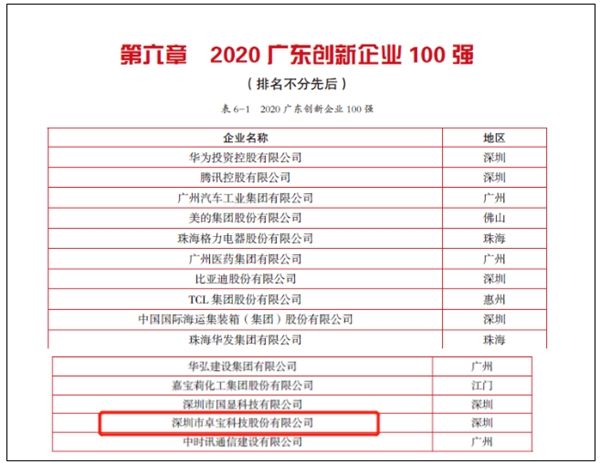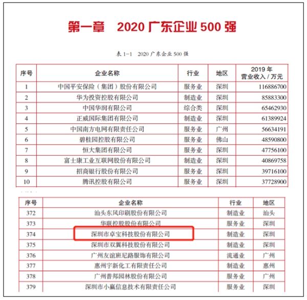 日前,《2020广东500强企业发展报告》正式出版,报告中发布了多份榜单,卓宝凭借强大的企业实力与技术创新能力上榜“广东企业500强”、“广东创新企业100强”。