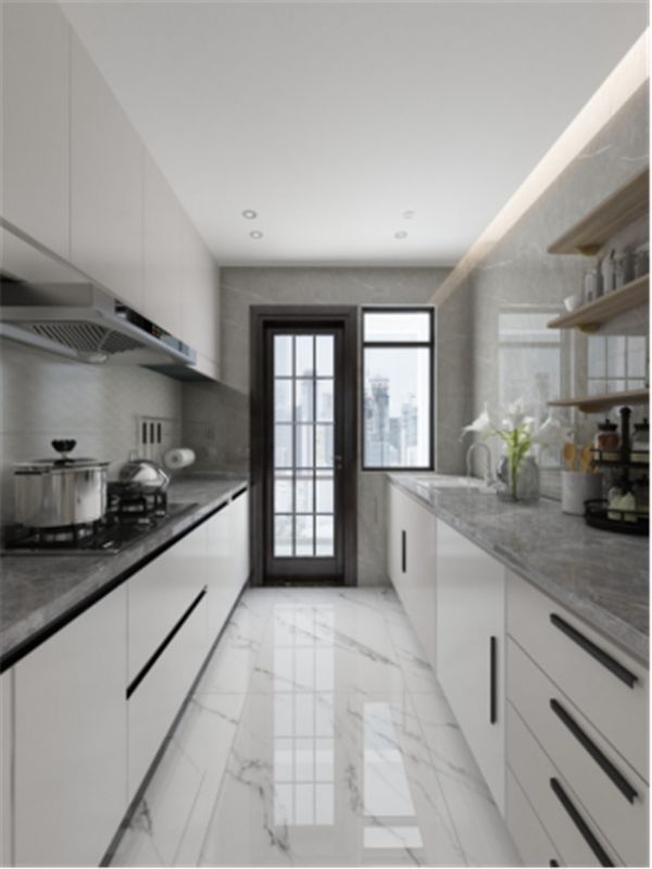 一字型厨房在小户型中是最为合理的设计之一,白色的橱柜面板与地砖颜色一致,简洁大方。空间分区合理,让人一目了然,充分体现了设计的功底。