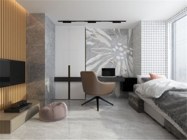 客卧兼具书房的功能,满足主人日常的工作和学习需求。有客人来的时候,也能为其提供一个可休息的地方。木饰面背景墙让人眼前一亮,不仅彰显了它独有的魅力,而且装点出了卧室空间的独特品位。