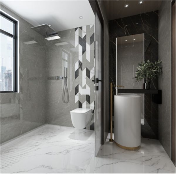 浴室几何线条的利落收边,给人以简洁的现代美感。摒弃复杂的浮夸设计,一切以人为本以舒适生活为设计原则。墙地砖颜色依旧以黑白灰为主,给人干净利落的感觉。