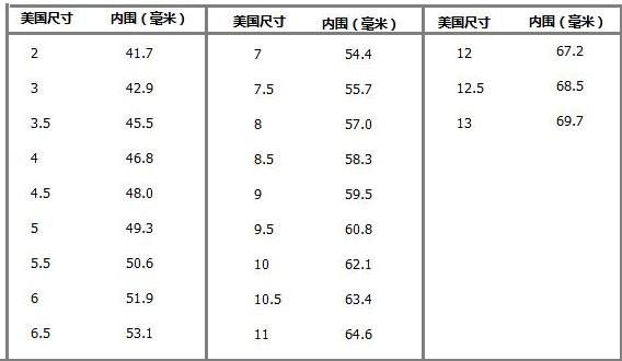 2、一般来说美国的戒指尺寸表,它的戒指尺寸号码是5号到12号之间,最小的5号对应的周长是49.3毫米,直径是15.7毫米,最大的12号对应的周长是67.2毫米,直径是21.4毫米。