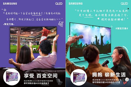 1月25日,55英寸、65英寸两种尺寸的Q60A系列QLED电视正式在天猫开售,同时三星也在上市期推出了多种优惠活动,购买三星畅薄Q60A系列QLED电视,即可领取爱国宾康体检卡、keep会员和瑜伽垫、唱吧小巨蛋、电视盒子等丰富好礼。即刻登陆天猫商城,在春节前夕为家人或为自己购入一台三星畅薄Q60A系列QLED电视,今年春节长假的宅家娱乐就靠TA了。