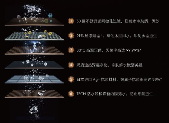 COLMO MAGIC系列电热水器以50目不锈钢滤网微孔过滤,拦截水中杂质泥沙;91%磁净阻垢,磁化沐浴用水,抑制水垢滋生;引进日本进口Ag+抗菌材质,搭配80℃高温灭菌,抗菌率高达99.99%;TECH活水轻松焕新内胆四水,涡旋速热深层净化,六重净化工序,守护每一道关卡,保证沐浴用水洁净。