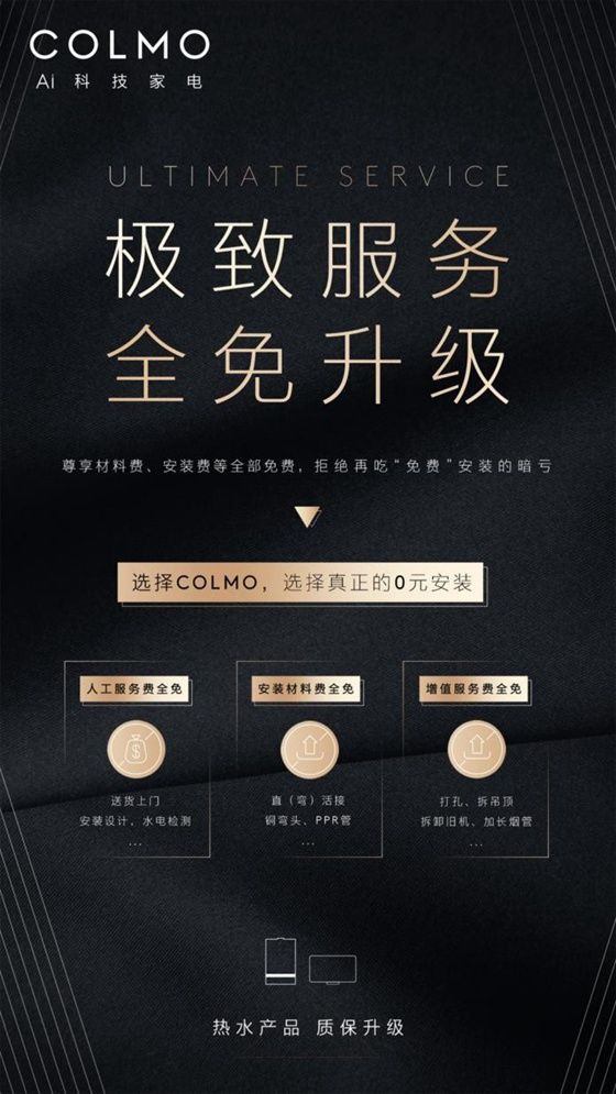 COLMO深挖用户需求,关注用户的实际操作使用,全新升级极致全免服务:人工服务费用、安装材料费用、增值服务费用三项全免,真正做到0元安装,减少不必要的支出,更享清净生活。