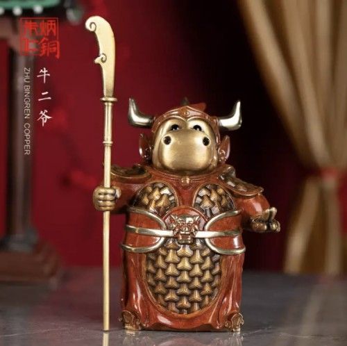 朱炳仁是绍兴“朱府铜艺”的第四代传人,也是铜雕技艺国家级非物质文化遗产传承人。在独特的铜雕技艺下,这位牛二爷手持青龙偃月刀,身披盔甲,两只牛角威风凛凛,整体造型魁梧威猛,神情中却又自带一股呆萌,见之令人心喜。这位牛二爷擅长保健康、保出行、保平安,可镇宅可招财,将它放在玄关,出入平安,开门见财,好意头十足。而且,玄关摆上它,就摆脱了收纳储藏的单一功能,平凡的小空间为之一亮,运势自然“牛”起来!