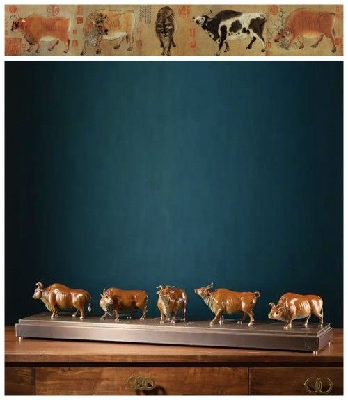 朱炳仁的五牛积福摆件,就是一件堪称艺术品的杰作。五牛来头不小,原型来自唐代韩滉的《五牛图》。韩滉画艺精湛,五牛姿态各异,历代文人墨客无不为之倾倒。现在,《五牛图》是中国十大传世名画,是少数几件唐代传世纸绢画作品真迹之一,也是现存最古老的纸本中国画,收藏于故宫博物院。经过朱炳仁大师的巧思,五牛从平面的画作上走出来,比例精妙,线条刚劲,栩栩如生。