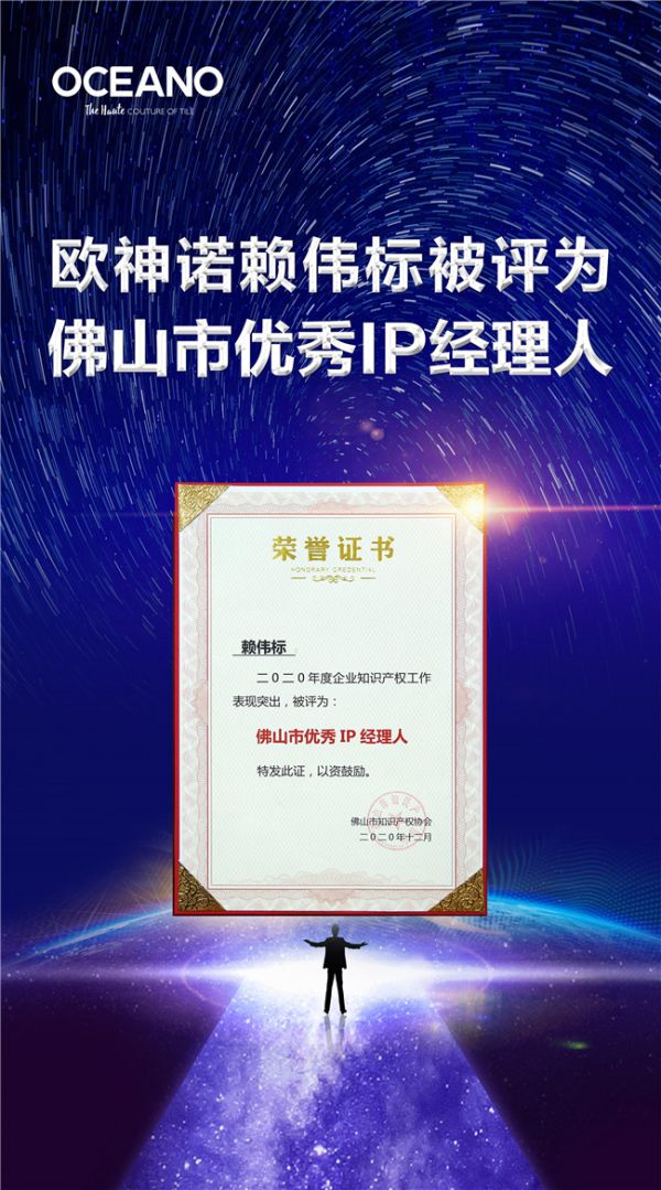 凭借在知识产权创造、运用、管理、保护等方面的优势,欧神诺瓷砖荣获“佛山市专利富豪企业”称号,首次上榜即位列榜首。同时,欧神诺法务部总监赖伟标在2020年度企业知识产权工作中表现突出,被评为佛山市优秀IP经理人!