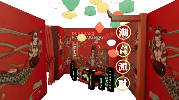 “飞天潮禧”主题展览位于商场M层东区MORE LAB 潮空间,以梦境为创作灵感,打造入梦、觅音、寻迹、造乐、点愿、珍藏六部曲,带来一场沉浸式的神秘敦煌之旅。展览入口处是彩云层叠的“入梦”打卡点,顾客可以在富有仪式感的布景下踏入梦境;穿过“觅音”引领通道,即可知晓已穿越幻境的人数;随后进入“造乐”空间,顾客还可跟随飞天仙人前往潮音派对,现场更有敦煌DJ酷潮驻场,带来飞天朋克重金属秀;此后依次移步至“点愿”,“寻迹”在光影互动媒体装置许下新年心愿,巨型佛莲底座上飞天彩带轻盈舞动,周边飘散花瓣,顾客置身其中,感受视、听、嗅、感多重感官的奇妙体验。最后,抵达“珍藏”,潮物云集的敦煌飞天主题快闪店将展示售卖敦煌博物馆正品文创周边。