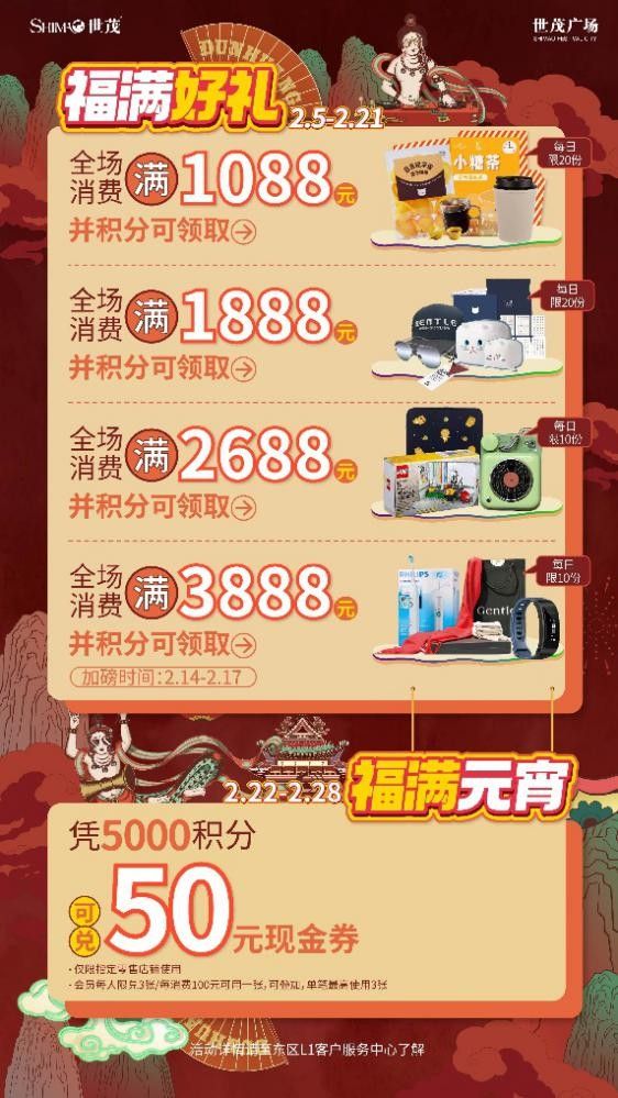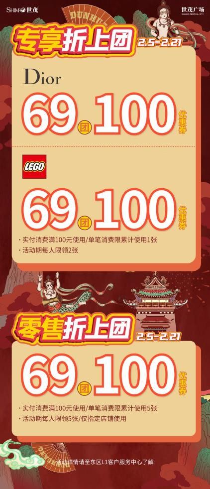 此外,上海世茂广场还为顾客带来丰厚的新春团购福利:包括巡湘记、绍东家、巴四老城区、春树拉面、西北馍王、兴义发等餐饮推出精选美食5折起活动、商场消费满50元领定制敦煌新春礼1份、 2月5日-2月21日,69团100元重磅上线,包括DIOR、乐高等主力店均参加活动;会员消费满额并积分即可获赠飞利浦电动牙刷等众多好礼;搜索上海世茂广场小程序参加敦煌AR打卡、HelloKitty新春集五福活动,还可收获更多优惠及精美礼品。