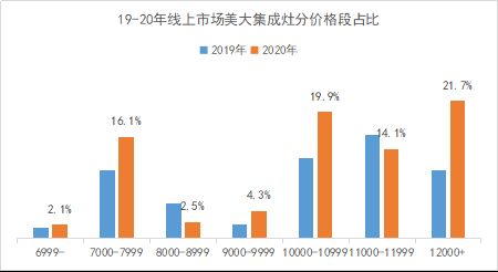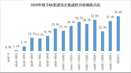 与此同时,美大品牌的高端定位也体现在价格段布局上的抢眼表现。奥维云网(AVC)监测数据显示,2020年,线上市场美大集成灶在10000-10999元价格段的占比为19.9%,在12000元以上价格段的占比为21.7%,处于明显的优势地位;线下KA渠道美大集成灶在10000元-19999元价格段的平均占比达到30%左右,在20000元以上的高端价位段的占比达36.4%,牢牢地锁定了全渠道市场的高端席位。