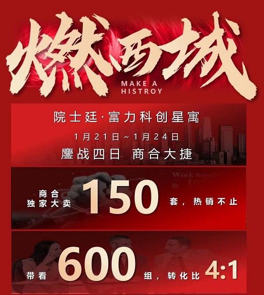 以富力城院士廷公寓项目为例,该项目销售已不可避免地进入销售疲软期,而在商合营销团队一盘一策的定制思路下,精准客源迅速整合,线上信息长尾分发,商合成功助力该项目达成5天劲销400余套的斐然业绩,这其中高效的作业体系可谓功不可没。