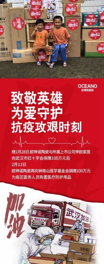 此外,欧神诺还承担社会责任,成立“诺动计划”为偏远贫困山区的儿童送去学习上、生活上所需物资,以微薄力量给予关怀与温暖。2020年初新冠疫情袭来,欧神诺向武汉市红十字会、钟南山医学基金会各捐献了100万元,共同抗疫。