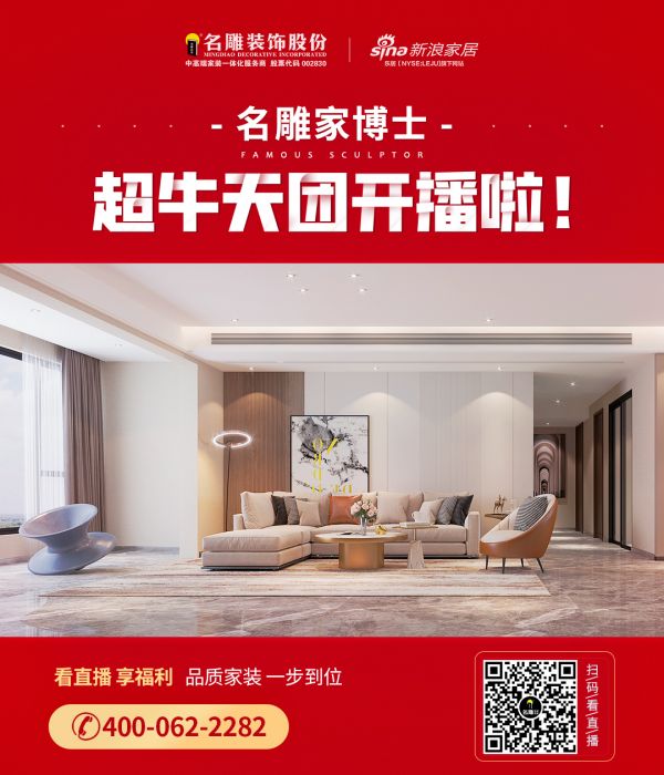 为解决装修人士的难题,作为装饰行业的标杆企业,名雕装饰股份公司暖心推出了春节档足不出户,在线尊享家装服务栏目,以直播的形式为有装修需求的用户答疑解惑、分享家装经验、解读最新家装趋势的同时,也探寻后疫情时代下现代人居理想的生活方式。