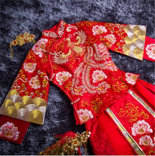 2、轻奢的金丝刺绣了一点缀在裙身,这样直接打造出一种高雅的气场,质感柔软清爽的缎面,光泽亮丽而超大的裙摆带有一种奢华的震撼,所以这种款式的秀禾服是很多新人的选择。