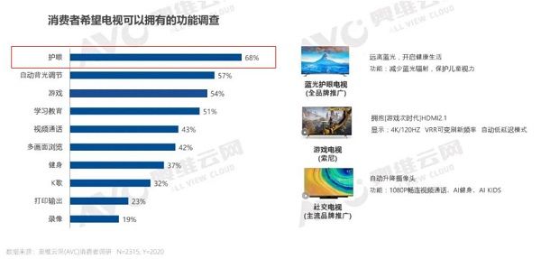 据奥维云网2020年消费者调研数据显示,在关于“消费者希望电视可以拥有的功能”调查中,“护眼”功能以68%高居榜首,这与2020年健康类家电畅销的大趋势一致。