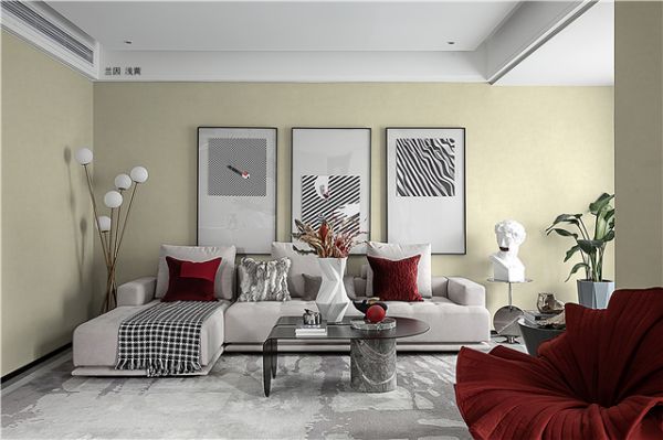 兰因浅黄的墙布,自带温暖、温馨之感,平绒的质地,则更能给空间“加温”。此外,将浅黄作为空间背景色,最大化的彰显了空间温馨优雅气息,暗红色抱枕、沙发椅的加入,在保持空间色彩平衡同时,更注入了一丝活力与激情,令整体空间更显温馨时尚!