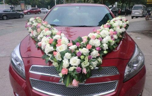 作为婚礼头车,要装饰的更加好看,可以用很多的鲜花和叶子拼成图案,这样会更加有喜感,鲜花装饰位置可以在车头正中间、1前1后、1左1右。