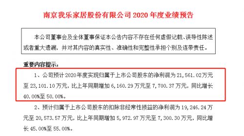 近期,我乐家居发布2020年度业绩预告公告,即使受2020“黑天鹅”事件影响,我乐家居依然实现净利润同比增长40.00%至50.00%。相比行业老大哥欧派家居的净利润同比增长10%-20%,头部对手索菲亚净利润同比增长5%-15%的数据来看,业绩十分抢眼。