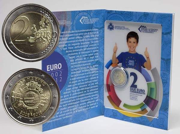 圣马力诺 2012年欧元货币发行10周年2欧元双金属卡装纪念币