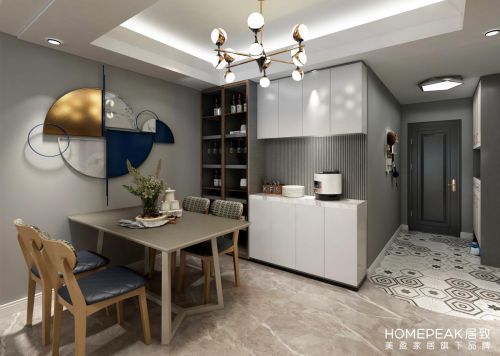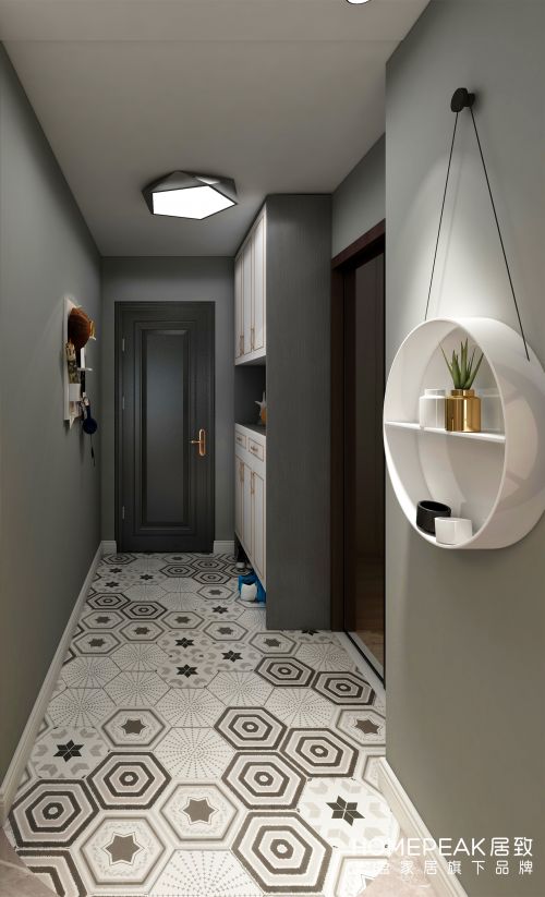 入户即见玄关,狭窄的玄关无法在家具上进行过多的装饰,那就选择将地面做成时尚经典的黑白小花砖,一进门就能感受到浓浓的生活仪式感。