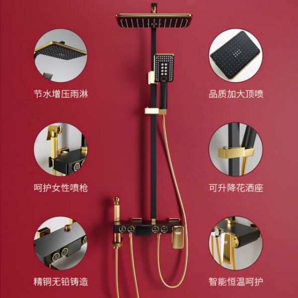 第一眼的美感是精致家居的必要条件,也正是如此。朗娇黑金恒温花洒也在外观设计上下了一番功夫。朗娇黑金花洒的主体从摆动式设计为圆盘按钮式,外围用金丝覆盖,配合底部的大片黑色,透露出一股复古工业感,装上它,浴室立马就多了一分美学气息。