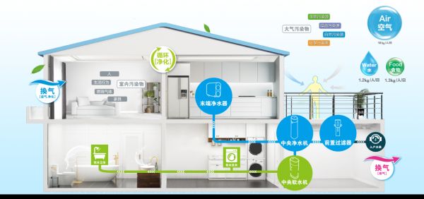 其体系包含前置过滤器、中央净水机、中央软水机、末端净水器,满足全屋净水需求。