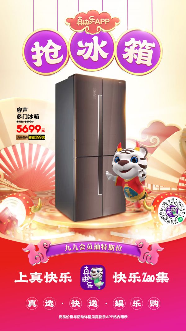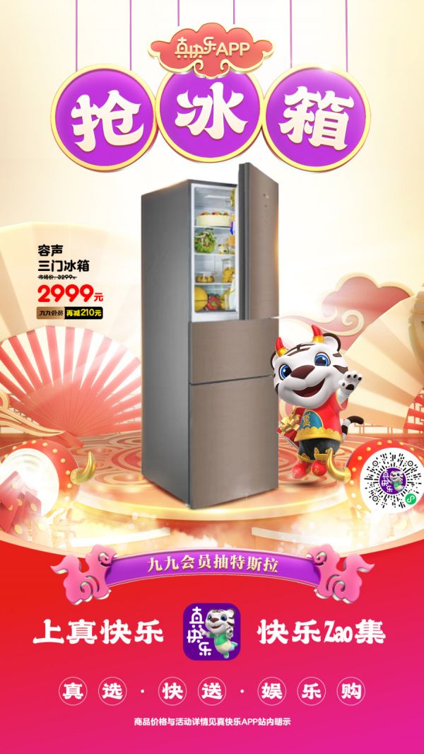 为了让珍贵的年味有个安心的家,“真快乐”APP联合容声、美菱、美的、海尔等众多一线家电品牌开启“快乐ZAO集”超级年货节,冰箱系列产品超优惠,还可以叠加九九会员福利,价格一减再减!不仅如此,所有真选产品还能享99天价保服务,上“真快乐”APP买冰箱,一点儿也不怕买贵啦!