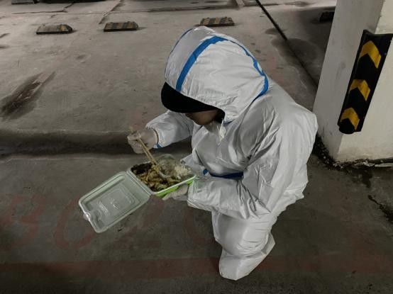 图为全员核酸检测现场,物业工作人员蹲在地上吃着早已冻凉的盒饭。