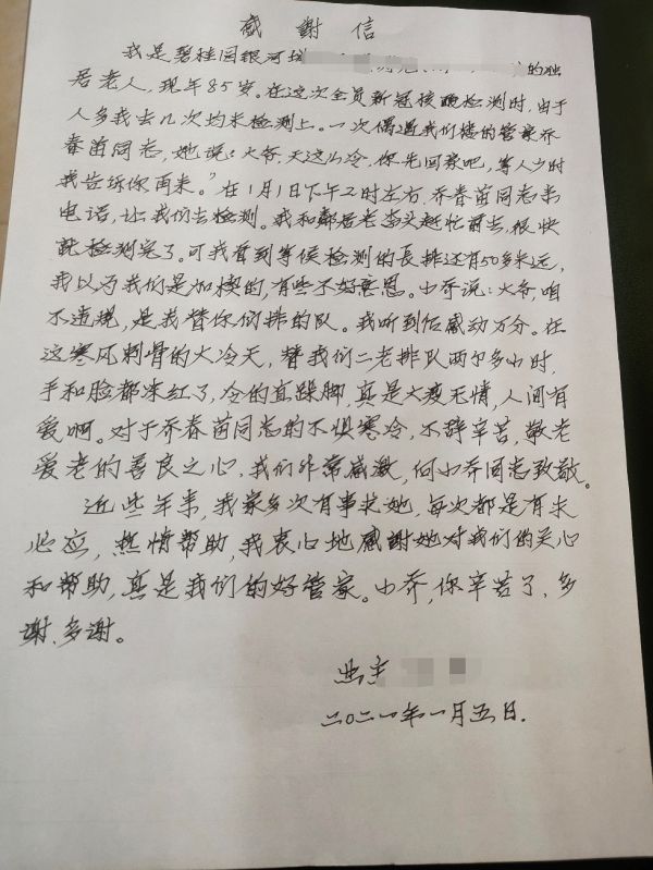 1月5日,沈阳碧桂园银河城物业办公室收到了一封手写的感谢信。这封感谢信来自两位80多岁的业主。原来,前一日,退休老人王大爷和李大爷被凤凰管家乔春苗通知后,没有排队直接做了核酸检。是乔春苗一直在寒风里帮两位老人排队,让他们不用等待,快速完成采样。