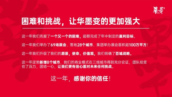 2020年初时,疫情爆发并急速传播,后愈演愈烈,导致新冠在全球各个国家肆虐。这次疫情对国家、企业、家庭、乃至个人,都是一次重大危机和考验,对华墨集团来说亦是如此。华墨集团在CEO王国平先生的主张下,对企业的远景、使命、价值观做了全面的升级,从原来的家文化升级到更具未来的不凡文化;逆势而上新开了8个城市,举办展会面积超过100万平方。这一年,对所有华墨的员工来说就是不凡的一年,在面临巨大的挑战的同时又做出了不凡的成绩。