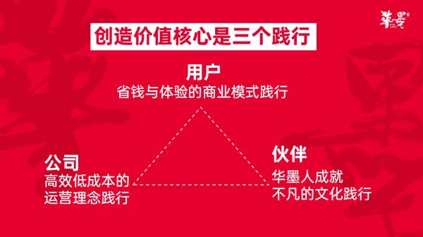 创造价值的首要要素是践行省钱与体验的商业模式。这是每个华墨人都应该确立的目标。将这个目标落实到工作,让用户感知到这种理念,让他们建立起“来华夏家博会是省钱的、体验是良好的”这种认知。其次是贯彻高效低成本的运营理念。树立“用户思维、坦诚互相,实干高效,开放进去”的理念。一个高效率低成本的组织,面对外部环境才更具竞争力。最后是不凡。虽然我们都是平凡的人,但我们想做不平凡的事。如何做到?就是将局部某一点做到绝对优势。利用公司的机制和资源,充分发挥自己的特长,并逐渐强化它,相信当每个人都拥有了自身的绝对优势后,就可以做到。