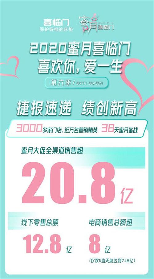 一个将用户健康如此放在“心”上的品牌,作为粉丝怎能不爱呢?在2020年10月23日至11月30日蜜月大促期间,喜临门总销售额突破20.8亿元,创下单项大促销额记录。这是属于喜临门与粉丝共同创造的记录。