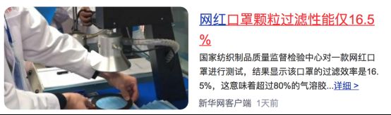 面对新冠肺炎疫情,佩戴口罩成为重要的个人防护方式之一。但现在的口罩产品五花八门,许多都号称具备抗菌,防霾、安全防护等功效的口罩并没有达到国家标准的要求。很多网上购买的网红弹性面料口罩,经由国家纺织制品质量监督检验中心的实验室,按照送检口罩的标准,进行颗粒过滤性能测试,口罩颗粒过滤性能仅16.5%。在好看与有用之间,如何达到一个平衡,是摆在很多科技防护公司面前的难题。