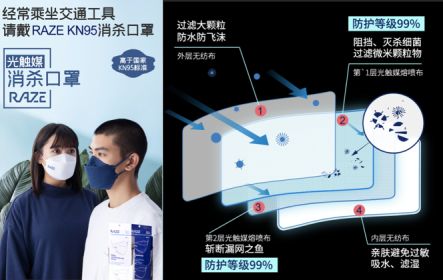 近期在某宝上出现了一款高颜值“主动消毒口罩”引起了不少人的注意。经过研究发现,这是一家总部位于香港主打创新净化公司-RAZE旗下的产品。这款口罩有一个特点,将光触媒技术引入到柳叶型KN95 口罩熔喷布中,赋予KN95口罩99.9% 的防护功能外,同时具备99%的主动消毒杀菌能力,真正做到科技力与颜值力共存。