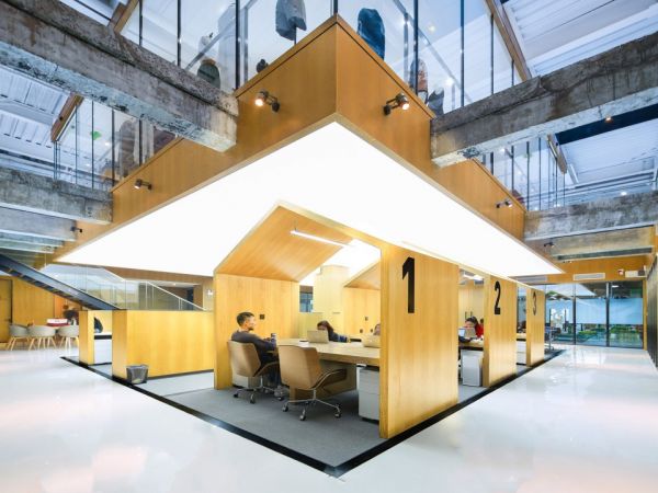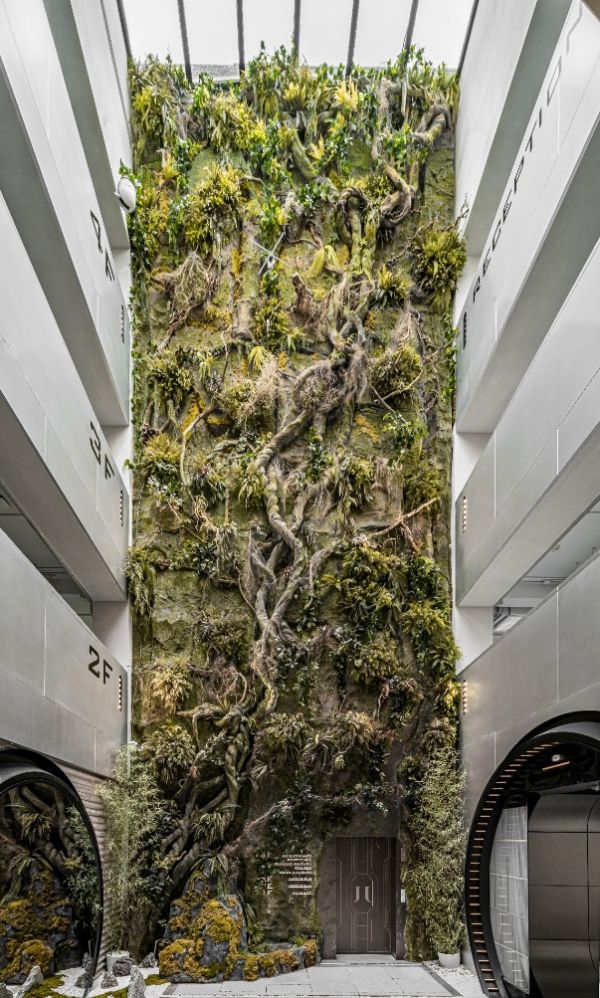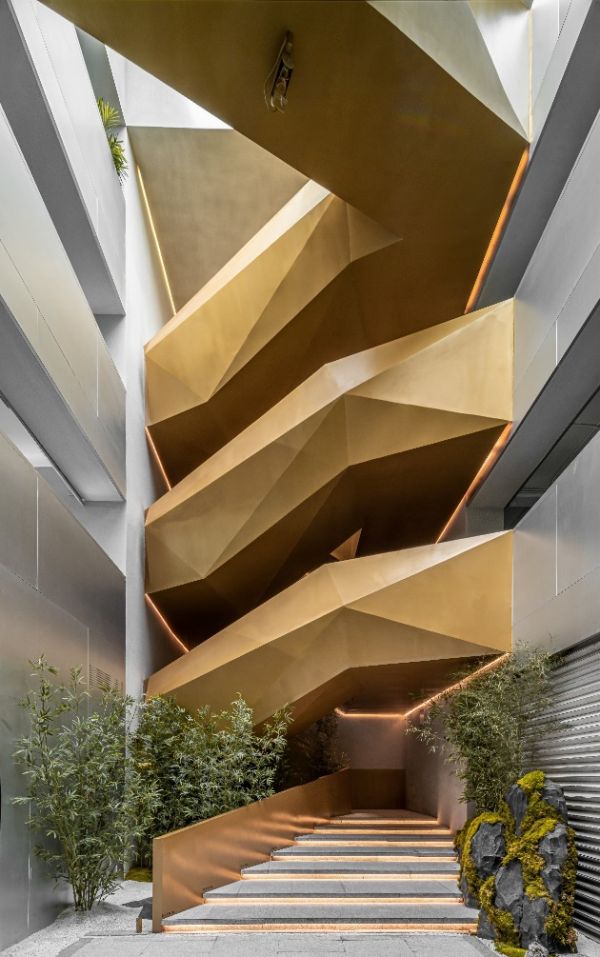 该项目是位于北京西二旗的整栋楼改造。入口的时空隧道、中庭里通高的黄金楼梯、异世界的绿植墙以及办公空间中的悬浮山岩……处处充满了科幻与想象力,让办公者如同走入异次元空间。该项目也是大观建筑的一个设计施工一体化项目,从设计到落地,建筑师在每一个环节都紧密参与。项目建成后整栋楼被快手公司租赁,用作自己的一处办公室。