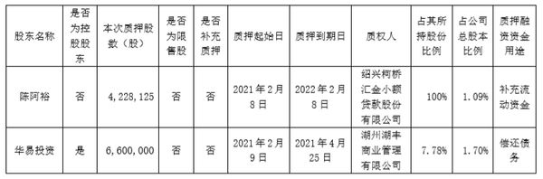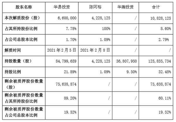 公告显示公司于2021年2月10日收到公司实际控制人陈阿裕先生及控股股东华易投资的通知,获悉其所持有本公司的部分股份解除质押并再质押。