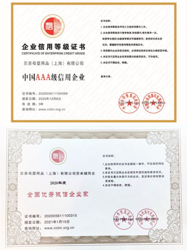 贝亲公司曾多次获得上海市和国家相关机构授予的多项资质和荣誉,据悉近期由中国企业改革与发展研究会、中国合作贸易企业协会经研究决定,联合开展的2020年度中国企业信用评价工作中,贝亲公司荣获“中国AAA级信用企业”,公司董事长贺来健先生也被评选为2020年度“全国优秀诚信企业家”,该荣誉是按照国务院《社会信用体系建设规划纲要(2014-2020年)》的总体要求,积极贯彻国家标准GB/T 31950-2015《企业诚信管理体系》,大力弘扬优秀企业家精神开展的中国企业信用评价工作。此次获评是贝亲公司多年来诚信经营的集中体现,意味着公司的履约能力、品牌信誉、社会责任等综合实力得到了行业和市场的认可。