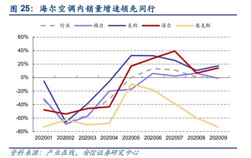 如下图所示,2020年1-9月,海尔空调内销量增速高于格力,也高于行业整体水平。